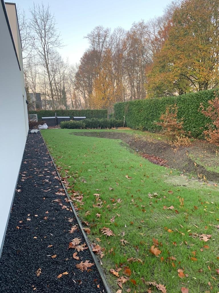 We kozen voor een combinatie van nieuwe beplanting en gloednieuwe grasmatten om de tuin meteen een verzorgd en volledig beeld te geven. De groene zones zijn zo opgebouwd dat ze structuur bieden zonder intensief onderhoud te vragen, terwijl de open grasvlakken een ruimtelijk effect creëren.