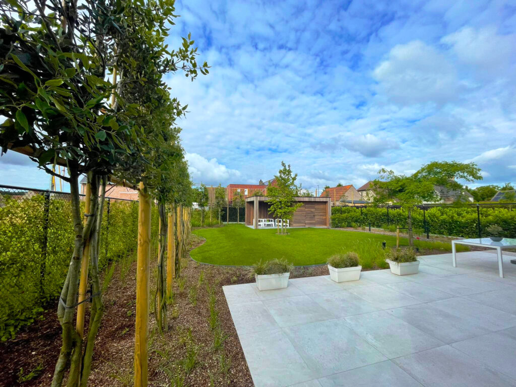 Het resultaat is een moderne leefruimte buiten die doorheen het jaar een rustige, natuurlijke sfeer uitstraalt en tegelijk een duurzame en logische structuur biedt voor dagelijks gebruik.