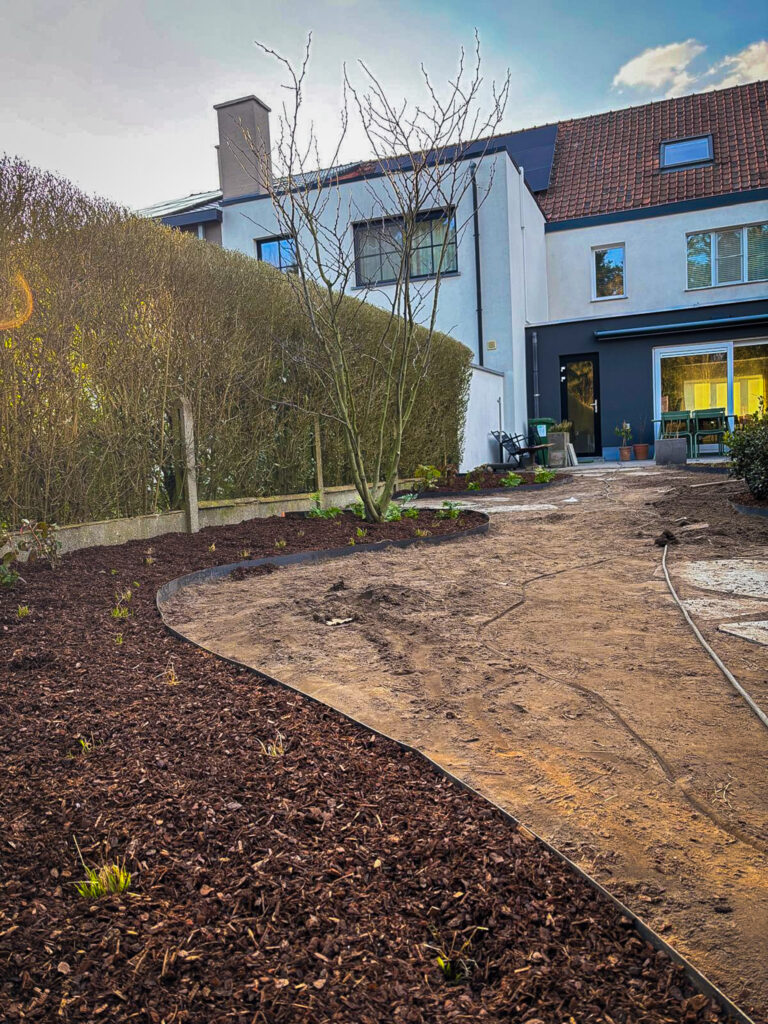 We stonden in voor de aanleg van de verhardingen, de opbouw van de nieuwe beplantingszones en de plaatsing van alle technische elementen op het terrein. De tuin blijft onderhoudsvriendelijk en behoudt doorheen de seizoenen een fris en ordelijk uitzicht.