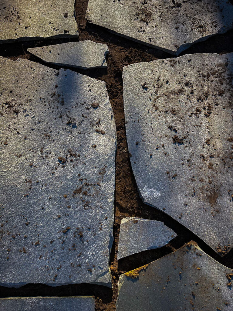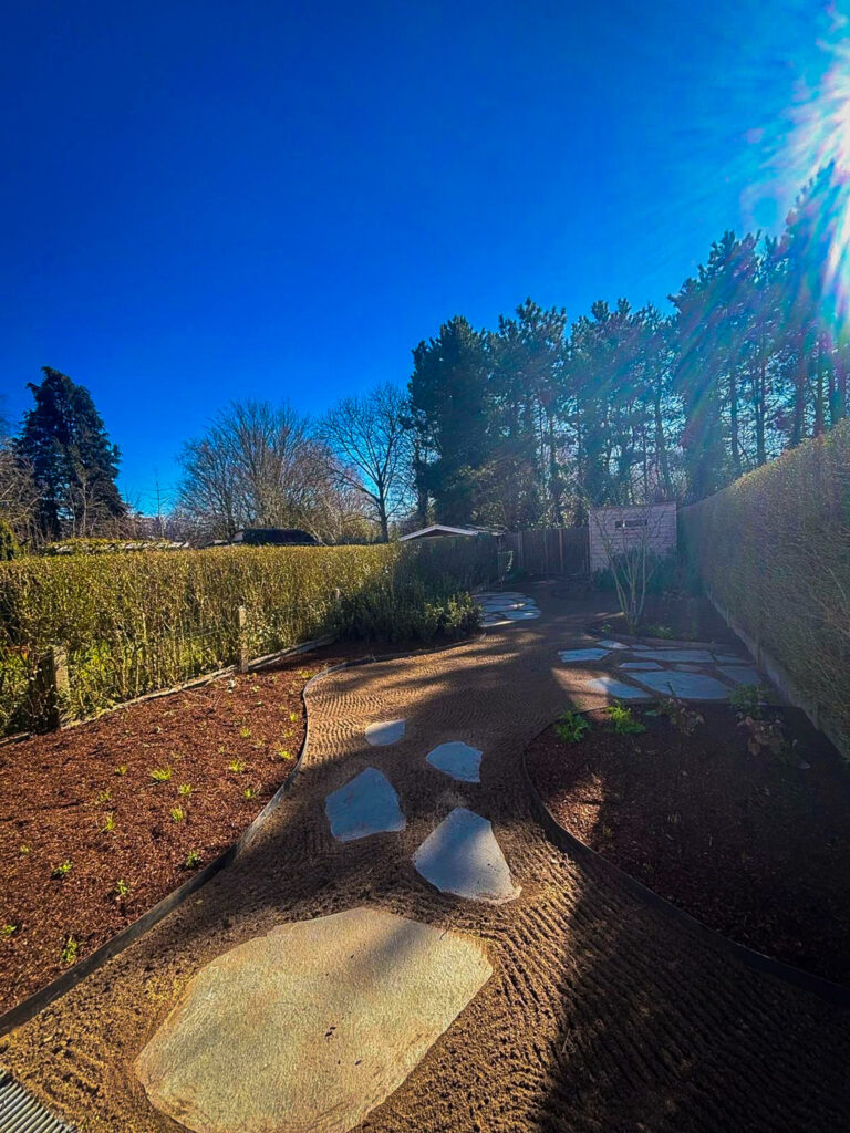 Het ontwerp werd opgebouwd rond een combinatie van natuurlijke verhardingen en groene accenten. De staptegels zorgen voor een rustige route doorheen de tuin, terwijl de nieuwe borders een warme overgang vormen tussen terras en woonomgeving. Door het materiaalgebruik af te stemmen op de architectuur van de woning ontstaat een samenhangend geheel met een verzorgd karakter.